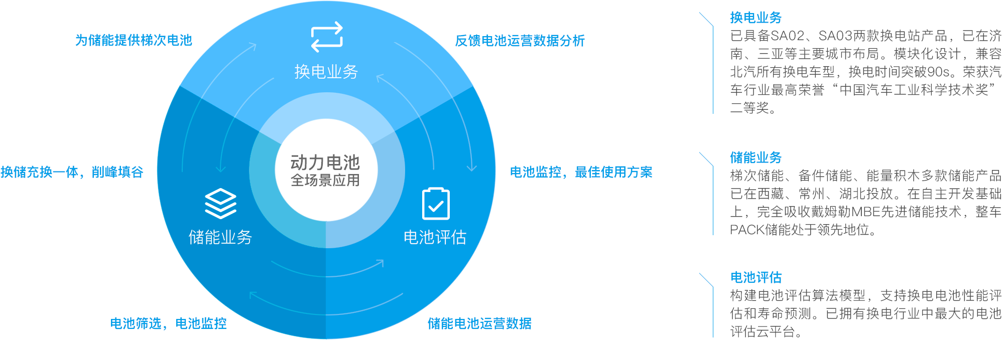 通过与国网电动汽车公司、宁德时代、法国电力、SK等多家世界500强和国有骨干企业合作,围绕换电站建设与运营,实现电池全生命周期价值最大化利用,持续为客户创造最大价值。